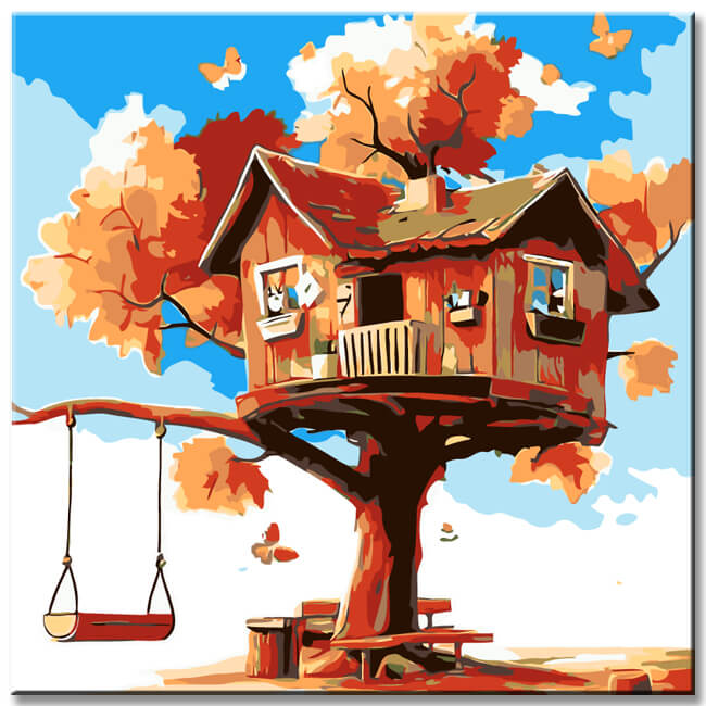 Paint by Numbers Art Illustration Big Brown Tree House with Swing