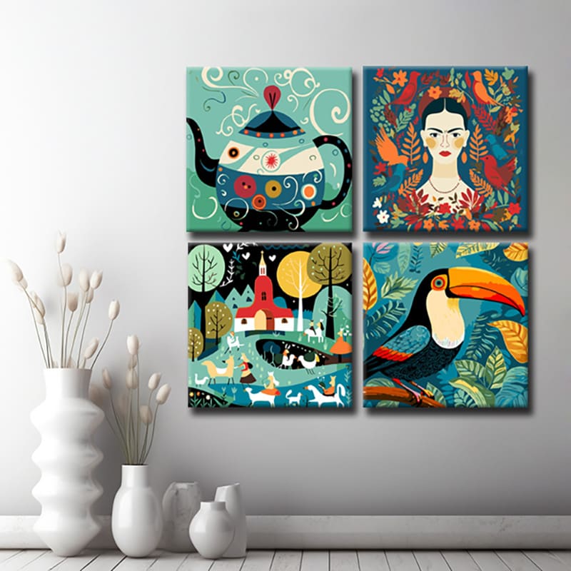 Folk Art on Picture Wall Stylish and Traditional Canvas Pictures for Your Wall Decoration 4-Panel