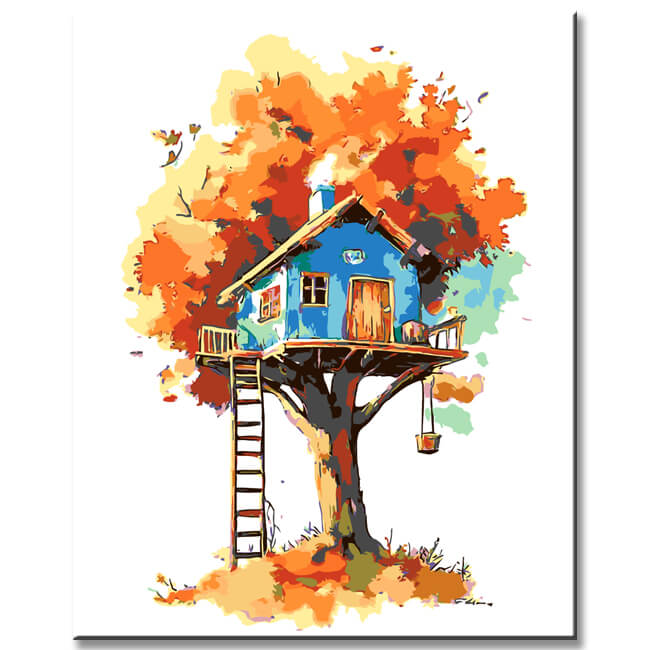 Painting by Numbers Art Illustration Blue Treehouse in Red Tree